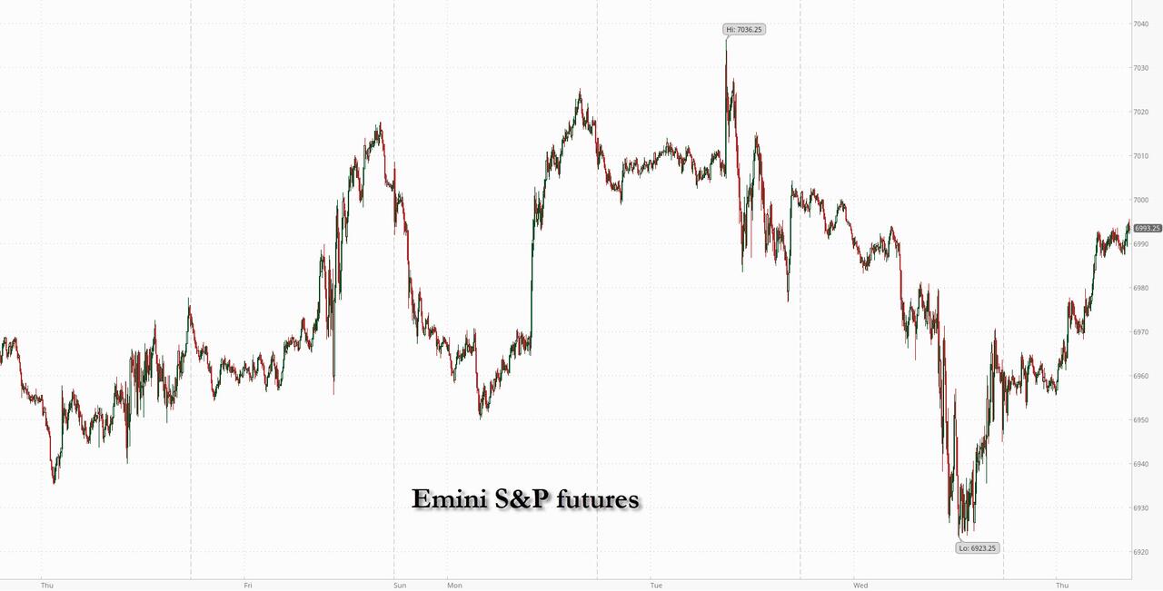US equity futures are higher led by Tech stocks which bounced back on Thursday after chipmaker TSMC revived confidence in the durability of artificial-intelligence demand, as signalling a strong outlook with $56BN in CapEx spending in 2026 (a 25% increase), restoring confidence in global AI growth and sending Europe’s ASML to a record high. Silver dropped for the first time in 5 days from a record high as the US held off from attacking Iran and refrained from imposing import tariffs on critical minerals. As os 8:00am ET, S&P 500 futures were 0.4% higher with Nasdaq 100 contracts +0.7%. Pre-market, Mag 7 are all higher led by NVDA (+1.4%), AMZN (+0.7%), TSLA (+0.5%) and MSFT (+0.5%).Goldman Sachs and Morgan Stanley are also higher after reporting solid Q4 earnings. Bond yields are unchanged; The US dollar is 7bps higher. Commodities are mostly lower: oil fell 4.4%; silver is down 2.0%; metals are mostly lower today. Situation in Iran is closely watched, as an Iran official pledged not to execute protesters. Trump said he has no plan to fire Powell in a RTRS article. Today’s US economic calendar includes January Empire manufacturing and Philadelphia Fed business outlook, November import/export prices, and weekly jobless claims (8:30am) and November TIC flows (4pm).