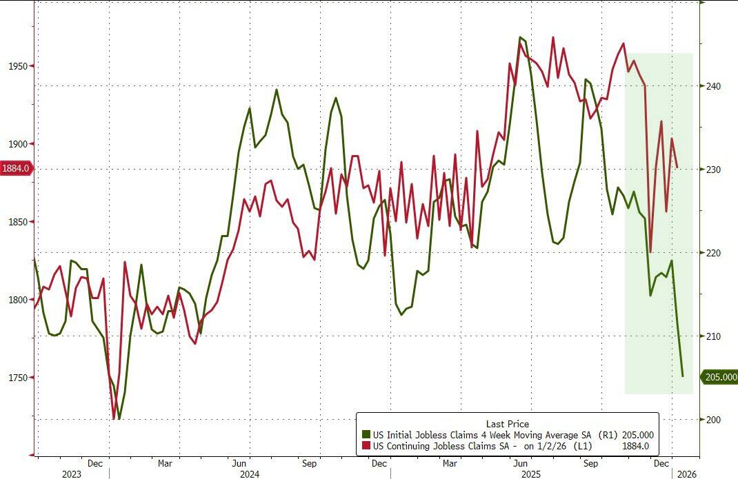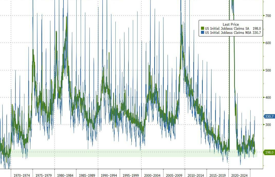 Once again, weekly jobless claims data shows no signs of pain the labor market with the number of Americans filing for jobless benefits for the first time dropping back below the Maginot Line of 200k (198k – below all estimates)…