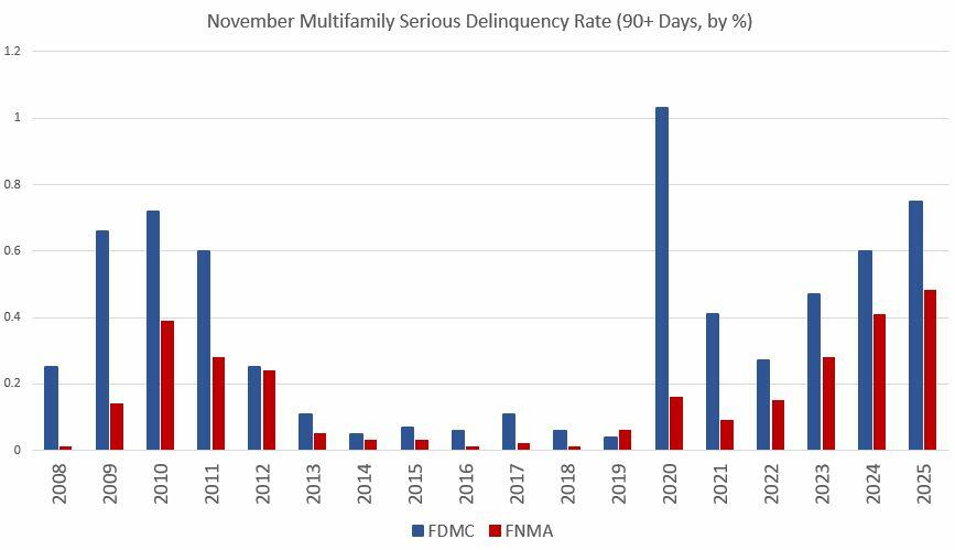 Freddie Mac’s delinquency report, on the other hand, shows delinquencies above the Great-Recession peak. During November, Freddie reported multifamily serious delinquency rate was 0.48 percent. That’s unchanged from October 2025, but up from November 2024’s level of 0.41 percent.