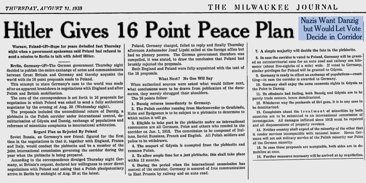 • his seventh offer of late 1939 to Poland to settle the Danzig Corridor issue peacefully, and finally,