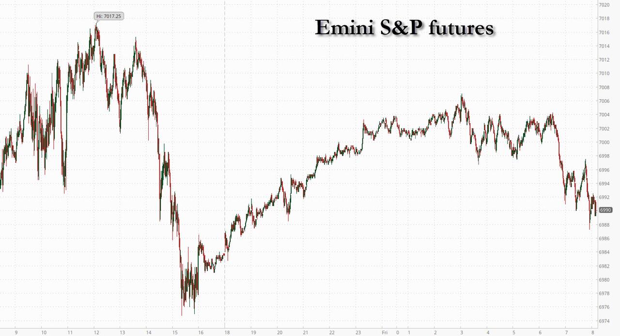 Futures are higher, and trading near record territory, led by tech as this year’s great rotation shows no sign of slowing, broadening the base of names driving Wall Street’s push back towards all time highs. As of 8:00am, S&P 500 futures were 0.3% higher with Nasdaq 100 contracts up 0.4% as the latest wave of enthusiasm for technology stocks carried into Friday. Overnight headlines were mostly muted. Pre-market, Mag 7 are mostly higher led by NVDA +1.1%; AI names (AMD +3.2%, AVGO +1.3%, MU +2%) continued their rally yesterday. Bond yields are unchanged. Commodities are mixed: oil added 1.2%, while silver fell -2.0%; ags are mostly higher. US session features industrial production data and three scheduled Fed speakers.