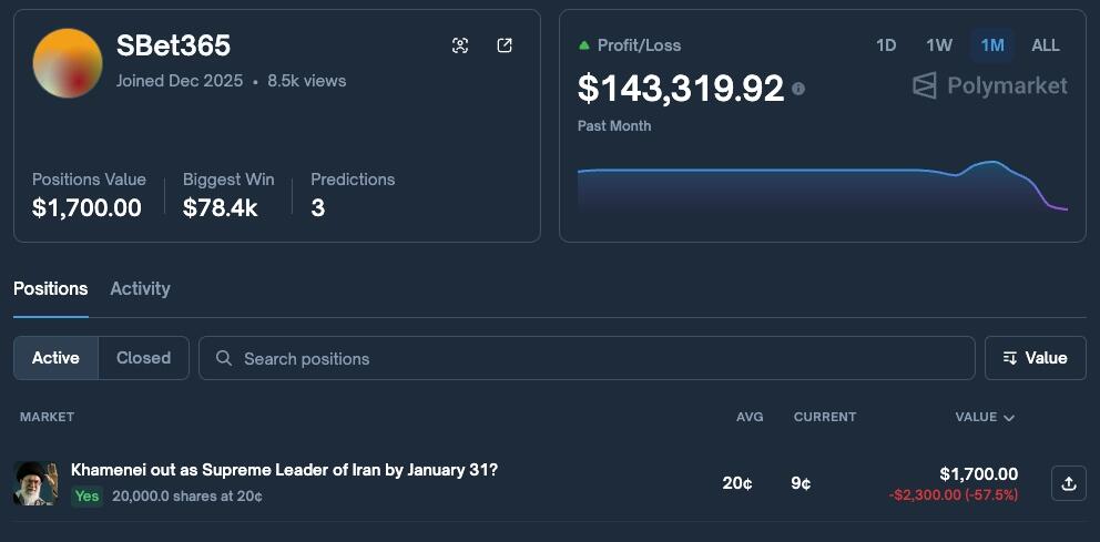 The remaining wallet, SBet365, placed another bet two days ago, predicting that Iran’s Supreme Leader Ayatollah Ali Khamenei would be ousted by Jan. 31, Lookonchain noted.