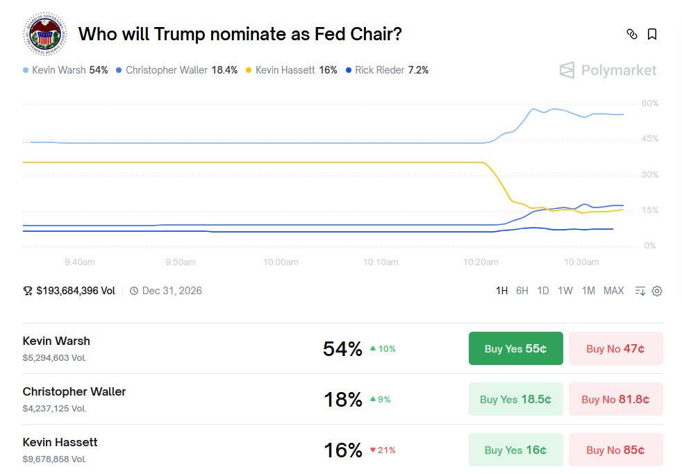 The news promptly sent Kevin Warsh’s Polymarket up to 54% from 34% previously making him the favorite, while Hassett tumbled from a 34% chance to be nominated to a 16% chance, below Chris Waller whose odds also jumped, from 9% to 18%.