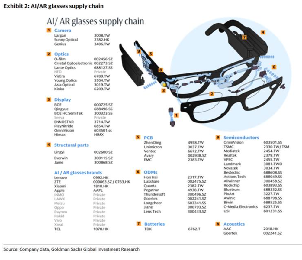 Before affordable smart glasses hit the consumer market this year and next, Goldman analyst Jerry Shen published a clear, straightforward view of the AI and AR glasses supply chain, breaking it down by the companies that supply the critical components behind these devices.