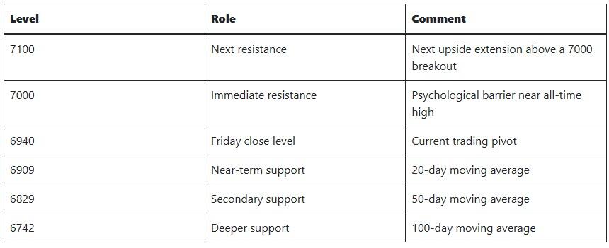 The next directional move will likely hinge on the market’s ability to clear resistance above 7000 or to test deeper support levels that define the current trend structure.