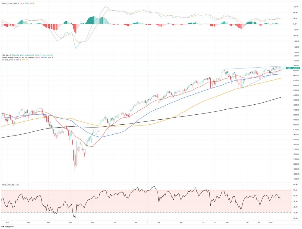 With the S&P 500 closing at 6940 on Friday, the technical conditions reveal a market in a controlled but consolidative state as key milestones approach. The index maintained its uptrend established late last year and into early January, signaling continued bullish momentum as higher highs and higher lows remain intact. This trend is supported by the S&P 500’s recent successful test of the 20-day moving average, with breadth indicators such as advancing stocks and total market participation expanding beyond just mega-cap technology names.