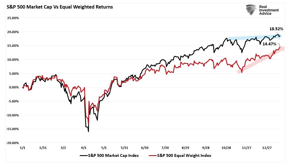 Notably, that sector rotation has pushed the equal-weighted index to new all-time highs. That surge continues to close the performance gap with the market-cap-weighted index as technology has lagged. However, technology, financials, and communications are now becoming more oversold. Such sets up a potential counter rotation as we move into the heart of earnings season starting this coming week.