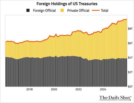 The falseness of those narratives is underscored by the rising and record levels of US Treasury bond purchases by foreigners. (If they were de-dollarizing or were worried about debasement, they would not be buying Treasuries, which are dollar-denominated.)