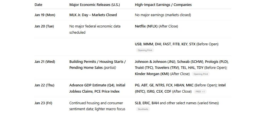 Market activity in the week ahead will be defined by a holiday‑shortened start, a slate of major economic releases, and a broad set of corporate earnings from S&P 500 names and key sectors. Monday, January 19, markets will be closed in observance of Martin Luther King Jr. Day, resulting in light trading and reduced volume once markets reopen on Tuesday. After an active first full week of earnings and macro data, investors will turn next to fresh corporate reports and several high‑impact economic releases, including advance GDP, jobless claims, and core inflation proxies. Given recent market resilience amid mixed macro signals, these catalysts will affect sentiment and positioning as Q4 earnings continue and markets digest inflation trends and labor market dynamics.