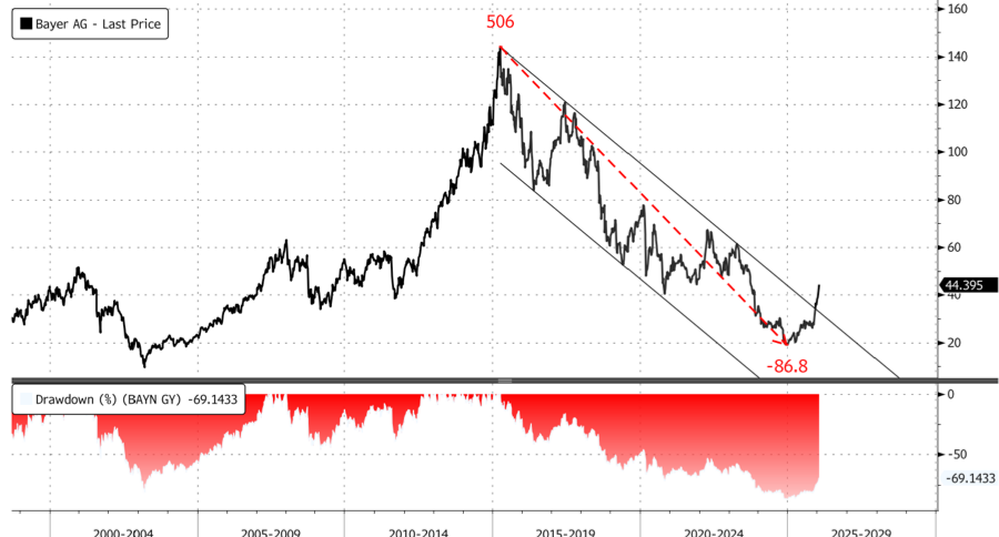 The Roundup litigation sent Bayer shares in Europe into a decade-long bear market. In 2025, what appears to be a bottoming year, the stock troughed near 2004 levels around 20 euros and has since more than doubled to roughly 44 euros. Shares are up more than 7% on Monday.