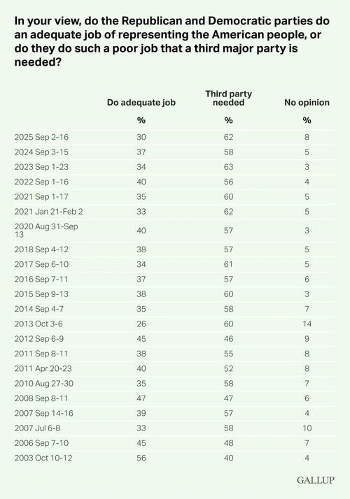 As political independence increases steadily, the desire for a major third party has also climbed. Sixty-two percent of American adults in 2025 said that a new party is needed compared to only three in ten adults who feel that the “Republican and Democratic parties do an adequate job of representing the American people.” In contrast, 56 percent of U.S. adults felt the two parties adequately represented Americans in 2003.