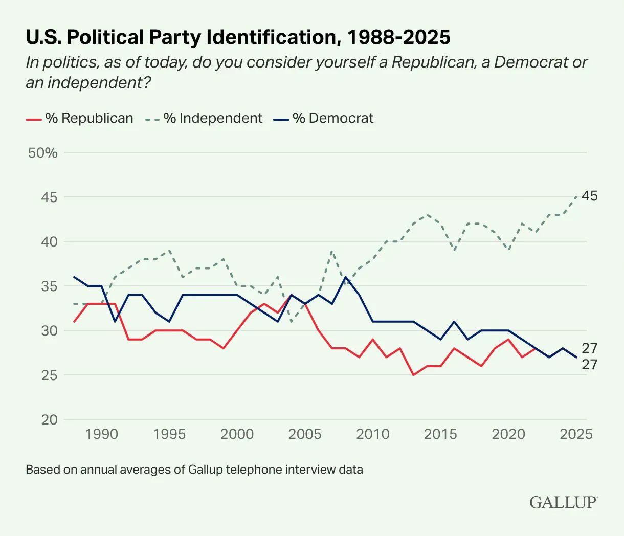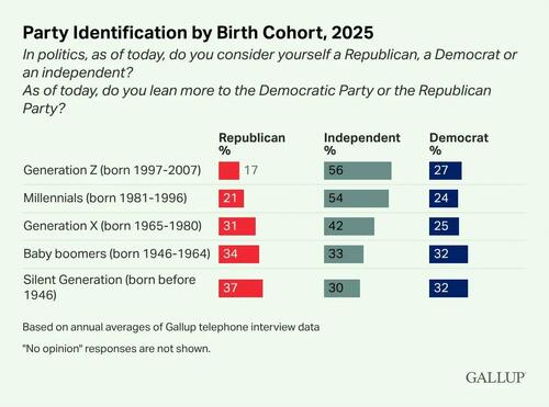 As reported by Gallup, a record-high percentage of American adults at the end of 2025 self-identified as political independents, 45 percent, including majorities of both millennials and Generation Z plus a plurality of Generation X. In comparison, less than three in ten Americans self-identified as either a Republican or a Democrat in 2025, respectively.