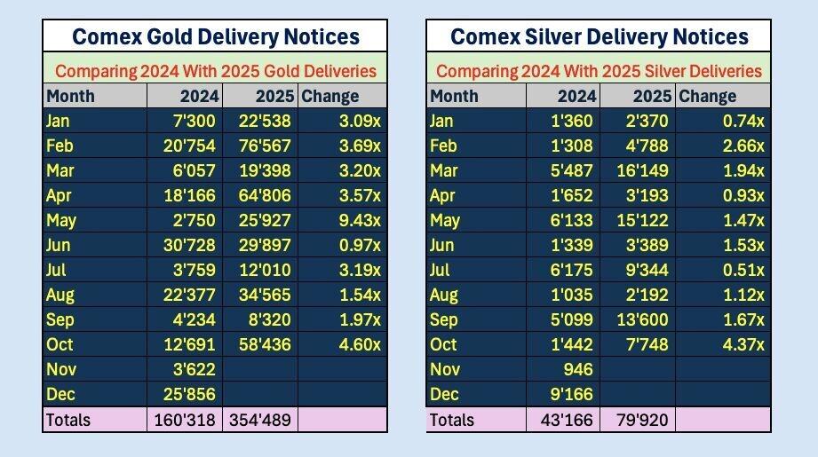 Via Clive Thompson on LinkedIn. Thompson adds: “This marks a dramatic behavioral shift: historically less than 1% of COMEX contracts resulted in physical delivery, but in 2025, some months delivery notices reached 100%.”