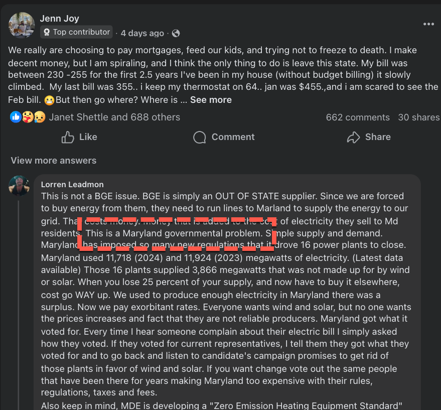 The Facebook group called “BGE Victims” has amassed 13.7k members, with many in the group pointing fingers at not just the local utility BGE or the grid operator PJM, but also the one-party rule of Democrats in the state who have masqueraded as competent managers but in reality are far-left activists looting the state’s coffers to fund pet projects from supporting illegal aliens to all things woke.