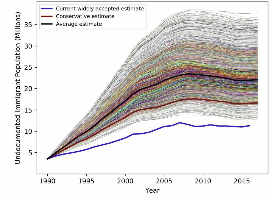 (The 2018 Yale estimate of illegal immigrants in the United States. Note the black line hovering just over 20 million.)