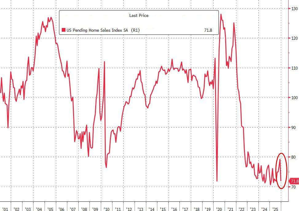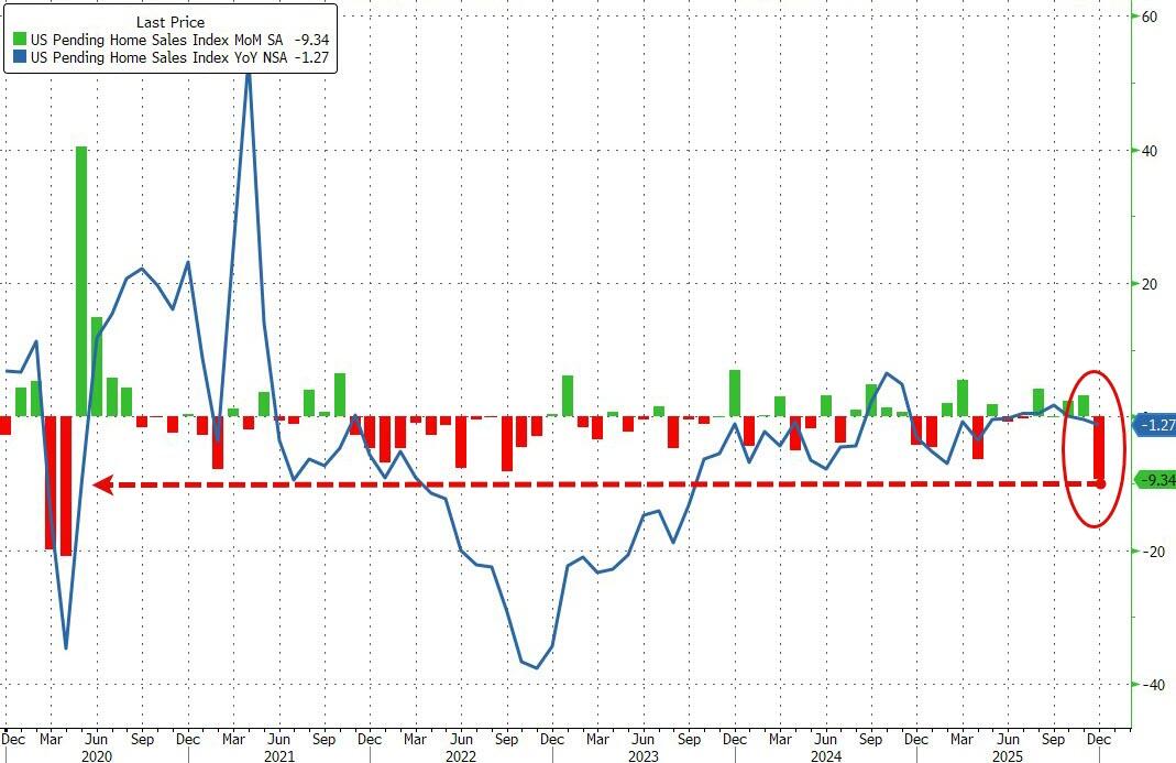 After four straight months of increases, US pending home sales crashed in December (-9.3% MoM vs -0.3% MoM exp), dragging sales down 1.27% YoY in 2025…