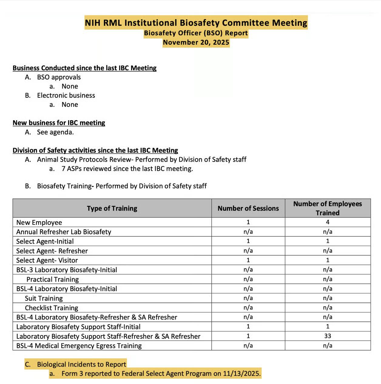 “Now, what we just uncovered is that in November 2025—just a couple months ago—quietly, NIH posted a biosafety test to see if there’s any from Rocky Mountain Lab, indicating that a select agent… Now, select agents are very deadly pathogens—serious health concerns for both humans and livestock. These are things used as bioweapons, things like ricin, anthrax, Ebola, tularemia. The Rocky Mountain Lab report just has a very benign item—if you didn’t know what we were looking for—one of these pathogens was either accidentally released, lost, or stolen from this NIH-funded bioagent lab that participates in dangerous animal experiments with the military.