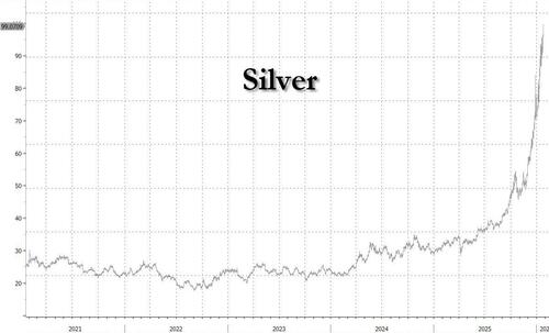 In commodities, spot silver rises 2.5% while gold erased an earlier gain to trade lower. Silver rose just shy of $100 and will likely surpass the key level today…