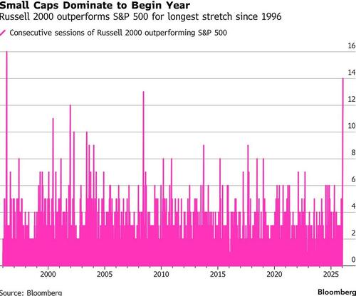 Small caps extended a winning streak over large-cap cohorts amid concern about a possible AI bubble and bets that an economic recovery will filter to broader swathes of the economy. The Russell 2000’s outperformance of the S&P 500 in 2026 is the longest such streak in 30 years.