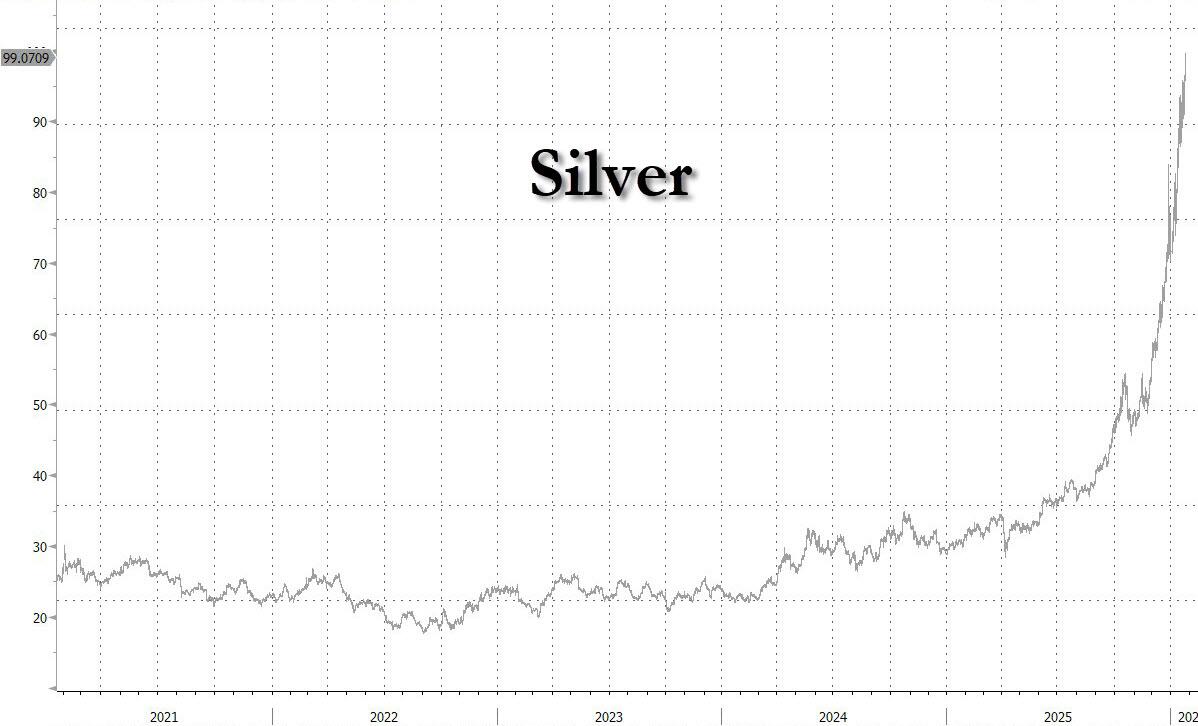 In commodities, spot silver rises 2.5% while gold erased an earlier gain to trade lower. Silver rose just shy of $100 and will likely surpass the key level today…