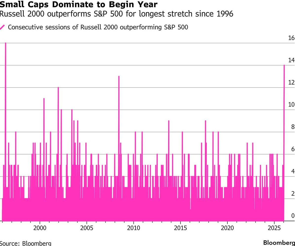 Small caps extended a winning streak over large-cap cohorts amid concern about a possible AI bubble and bets that an economic recovery will filter to broader swathes of the economy. The Russell 2000’s outperformance of the S&P 500 in 2026 is the longest such streak in 30 years.