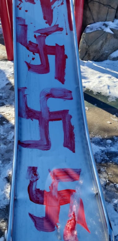 They were painted on playground slides and on the wall of a handball court in red, yellow and blue paint with other antisemitic vandalism.