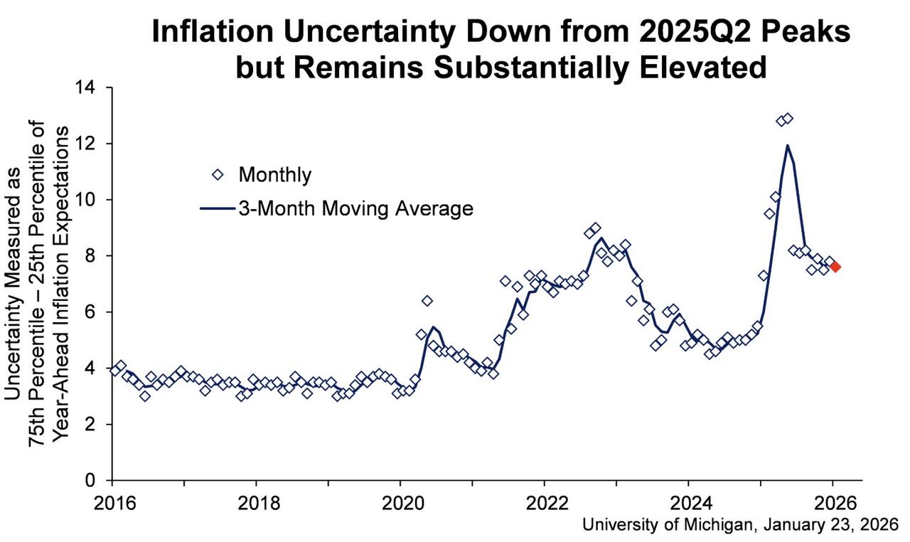 Aside from tariff policy, consumers do not appear to be connecting foreign developments to their views of the economy. Hsu notes that interviews for this release concluded on January 19th, two days after Trump’s social media post announcing additional tariffs on eight countries in Europe.