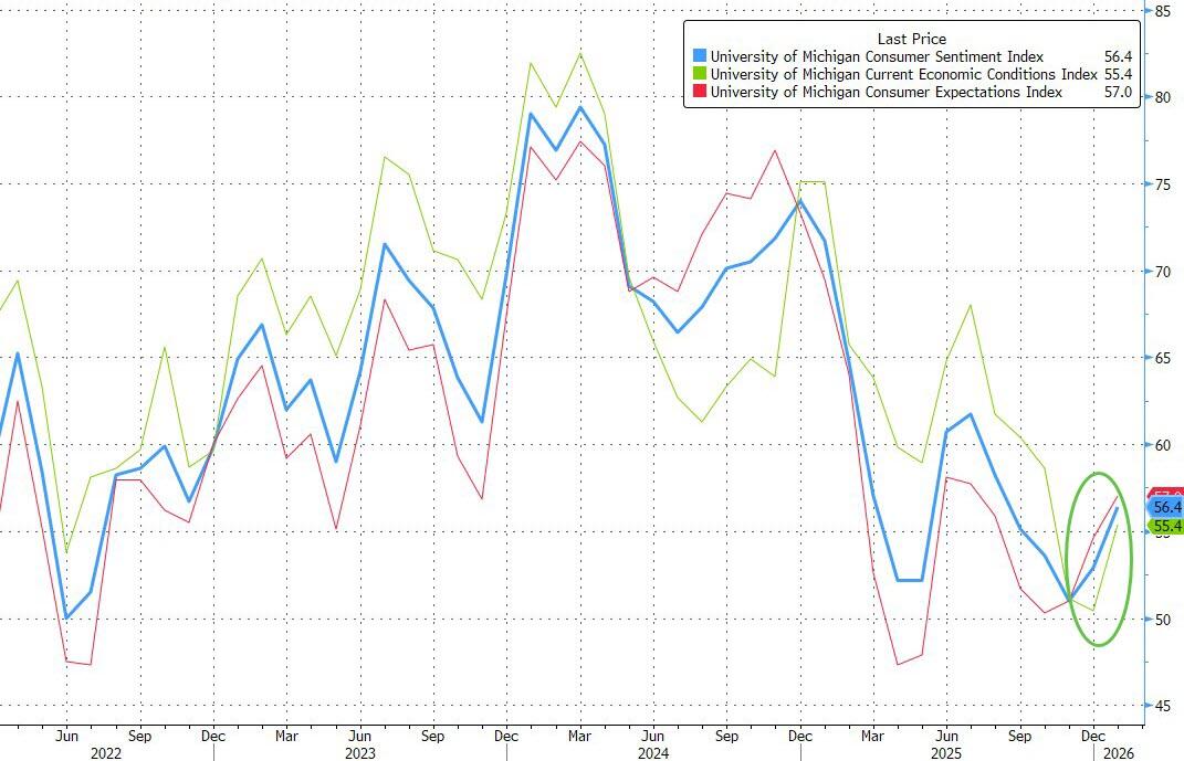 Having ended 2025 at the lowest Current Conditions Sentiment levels in, well, ever… expectations for preliminary January data were for a modest rebound… and it did…notably more than expected (and a pick up from the flash print):