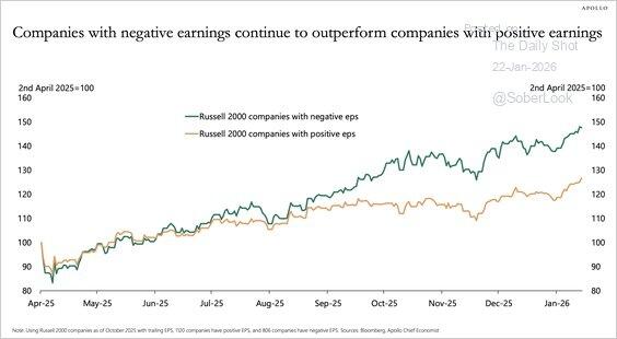 Rotation is evident beneath the surface. Small‑cap stocks and cyclical sectors have outperformed as of late, pushing the Russell 2000 to a series of record highs and outperforming megacaps year‑to‑date. However, small-caps are now very overbought and extended, suggesting a near-term rotational risk is becoming more likely. Furthermore, this shift away from the largest, momentum tech names, which generate a significant share of earnings growth, to more economically and non-profitable companies is a risk if economic “reflation” fails to mature.
