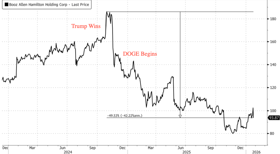 Shares of Booz Allen are down 7.5% in the cash session this morning, marking the worst single-day decline since October 24, when the stock fell about 9%. Shares have been cut roughly in half since President Trump’s November 2024 election victory, as Elon Musk’s DOGE initiative began aggressively targeting waste, fraud, and abuse across the federal bureaucracy in early 2025.