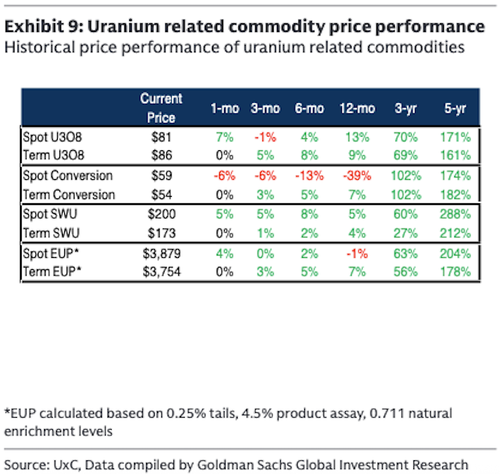 As also noted by Goldman Sachs, the tightening of supply from Russia for U3O8 and conversion/enrichment services has sent prices almost straight up over the past few years since the start of the Ukraine-Russia war.