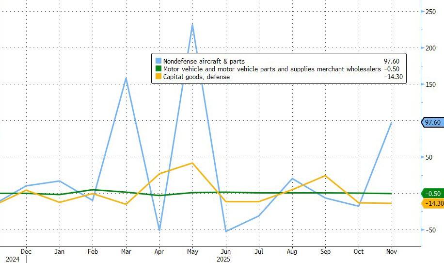 US Durable Goods Orders soared 5.3% MoM in (admittedly very lagged due to the shutdown) preliminary November data (significantly exceeding the 4.0% MoM expected and a major rebound from October’s 2.1% MoM decline), boosted by bookings for commercial aircraft and other capital equipment.