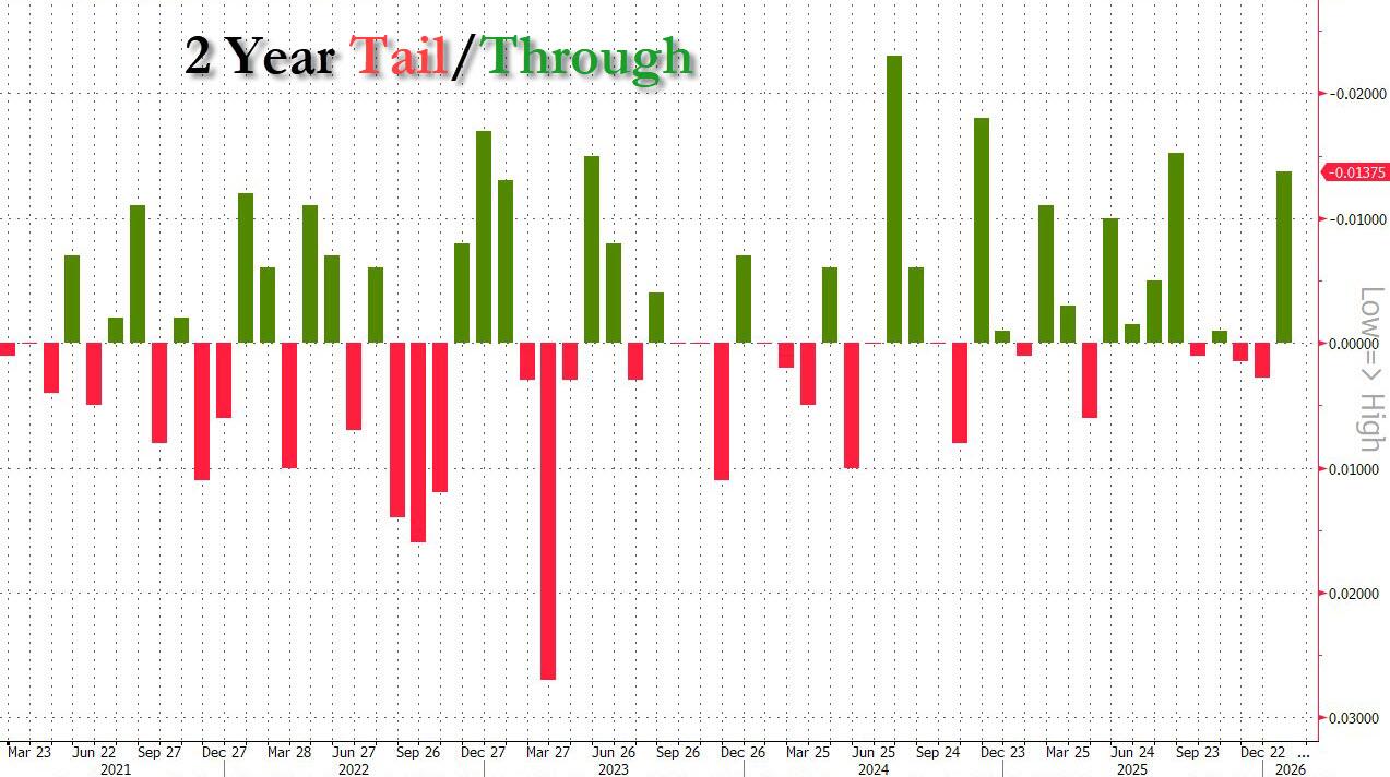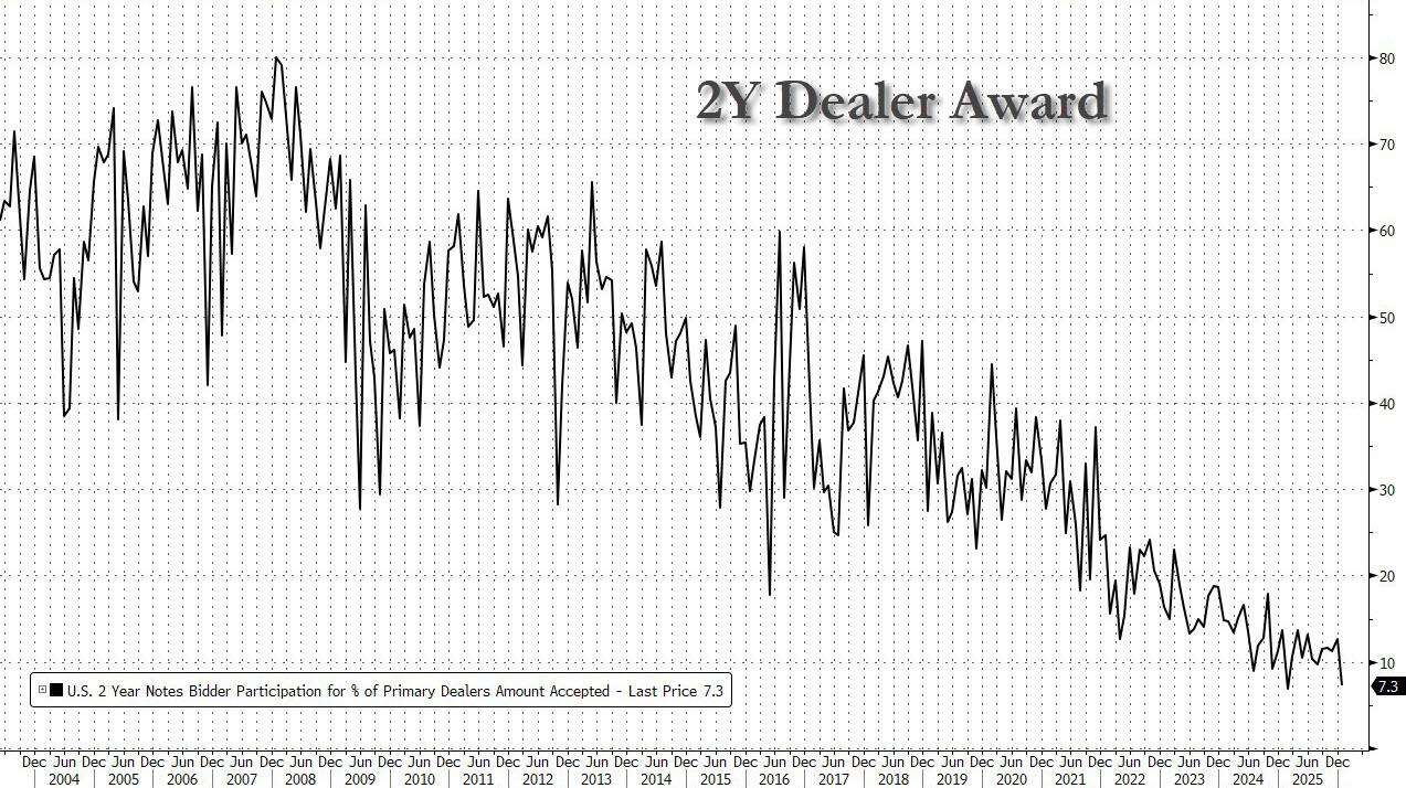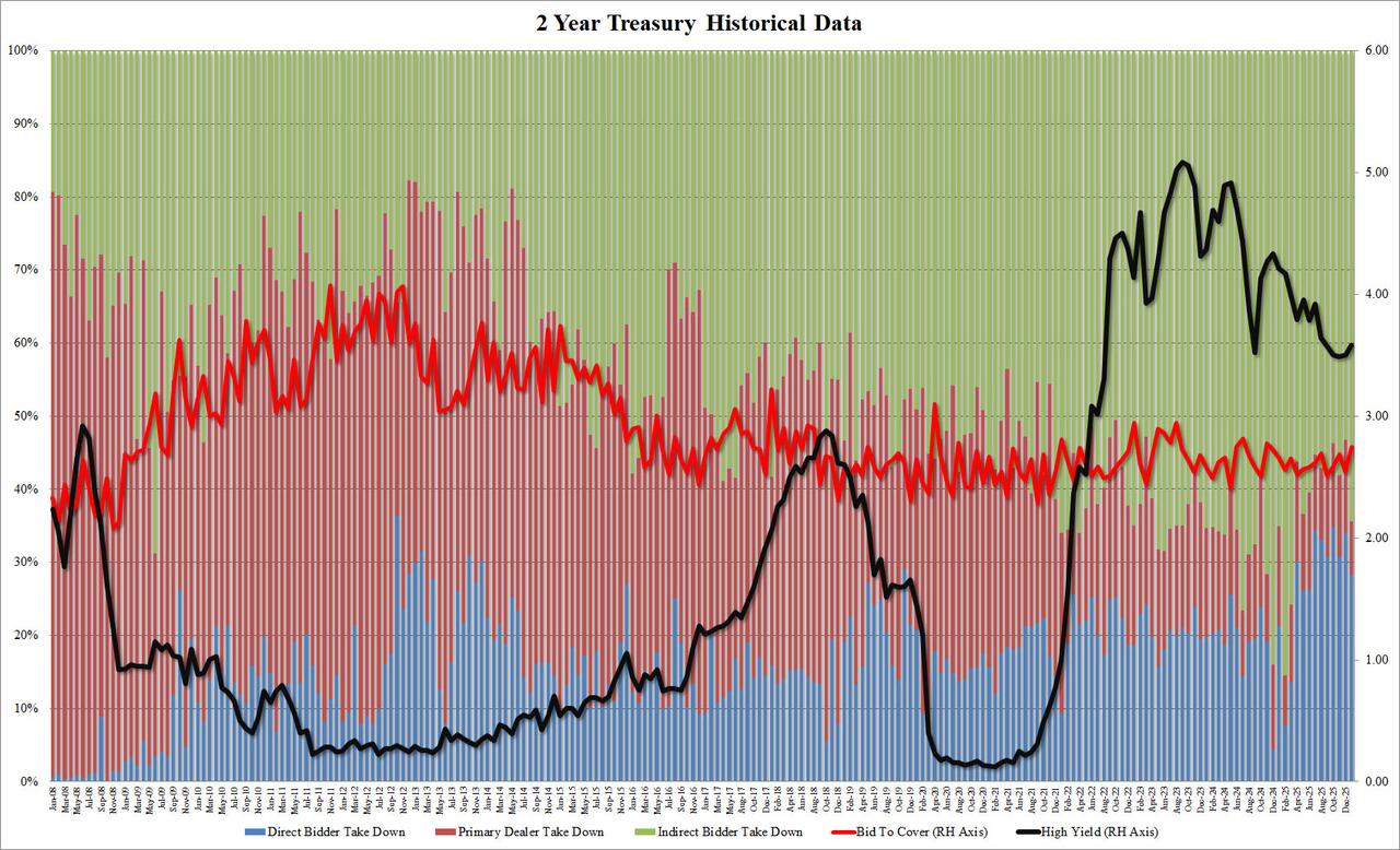 Stellar 2Y Trasury Auction: Surge In Indirects & Bid-To-Cover; Second Lowest Dealers On Record