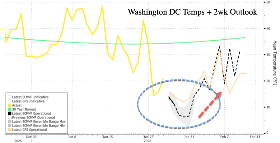 The massive winter storm that disrupted US energy production, sparked the most flight cancellations since Covid, and paralyzed much of the eastern half of the country for days is finally over. BofA chief economist Aditya Bhave has warned that the winter blast could deliver a meaningful hit to first-quarter GDP. However, the eastern half of the US is not in the clear yet. At least another week of brutally cold weather is forecast, which could keep pushing power grids to the brink.