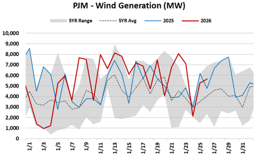 During peak demand periods in PJM – the nation’s largest grid operator – thermal and nuclear generation dominated the dispatch stack. As the cold conditions arrived, natural gas provided 43% of generation and coal contributed 23%, while wind and solar fell to a combined 3-4% of the total fuel mix.