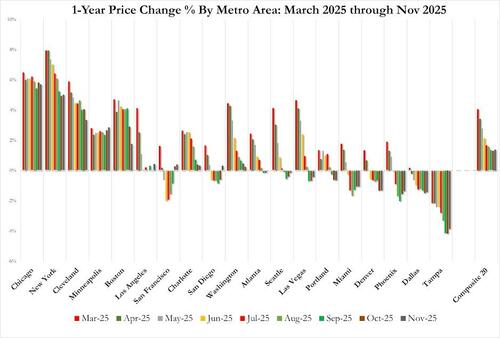 Other Sun Belt boomtowns remain under pressure as well: Phoenix (-1.4%), Dallas (-1.4%), and Miami (-1.0%) each continue to see year-over-year declines, a dramatic turnaround from their pandemic-era strength.