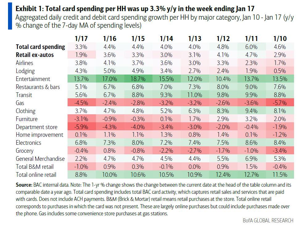 In his analysis Bhave used the latest BofA aggregated credit and debit card data (report available to pro subs) to zoom in on the effect of Viola. Total card spending was down 3.7% y/y in the week ending February 19, 2021, compared to a trend of about +6% y/y in prior weeks.