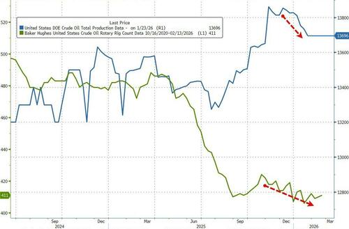 Crude production fell to 13.7 million barrels a day last week, down by 36,000 barrels a day from the previous week. The drop may reflect the initial impact of the winter storm that hit the US in recent days and came as the number of rigs drilling for oil edged higher for a second week, with 1 unit put into operation last week, according to Baker Hughes.
