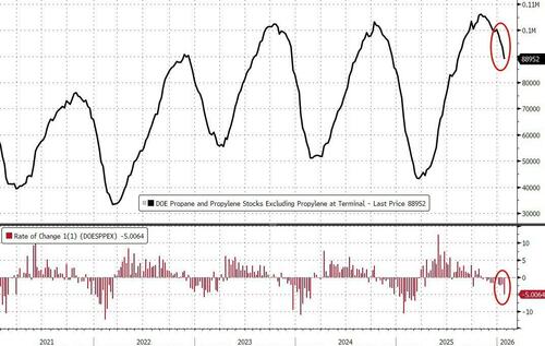 Bloomberg reports that the 6 million barrel draw (which was the biggest since October) was led by a decline in crude inventories and also the biggest drop in propane inventories since early last year ahead of the big freeze