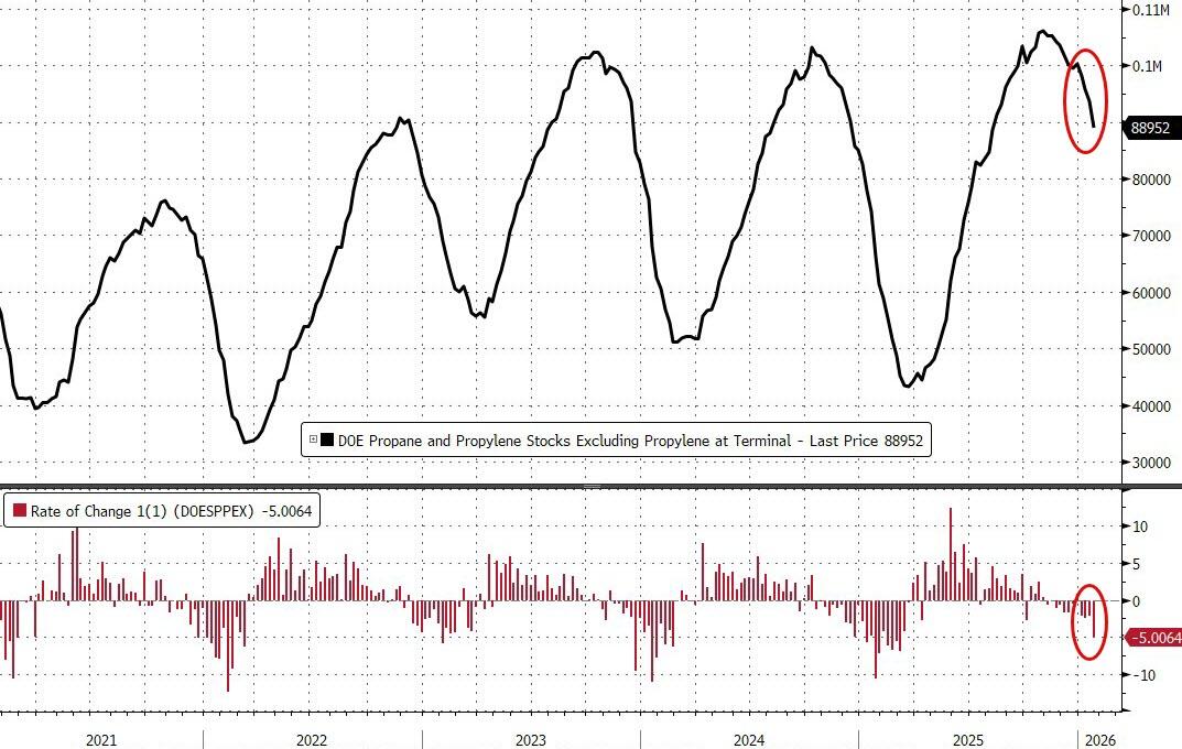 Bloomberg reports that the 6 million barrel draw (which was the biggest since October) was led by a decline in crude inventories and also the biggest drop in propane inventories since early last year ahead of the big freeze