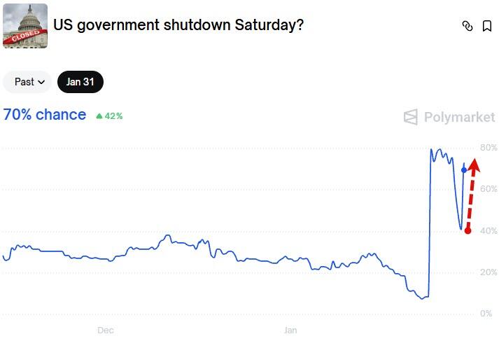 The odds of a government shutdown have surged back up to 70% (according to prediction markets), after a bipartisan deal brokered by President Donald Trump and Senate leaders to avert a partial government shutdown ran into trouble late on Jan. 29 as objections from lawmakers prevented a quick vote.