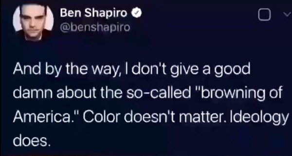 At the same time, advertising constantly promotes mixed-race couples, often with mixed-race children. Is it OK to want to preserve the habitat of white people or worry about them being genetically swamped? Or should white people just disappear? It looks like Ben Shapiro wouldn’t care. He doesn’t “give a good goddam about the so-called ‘browning of America’.”