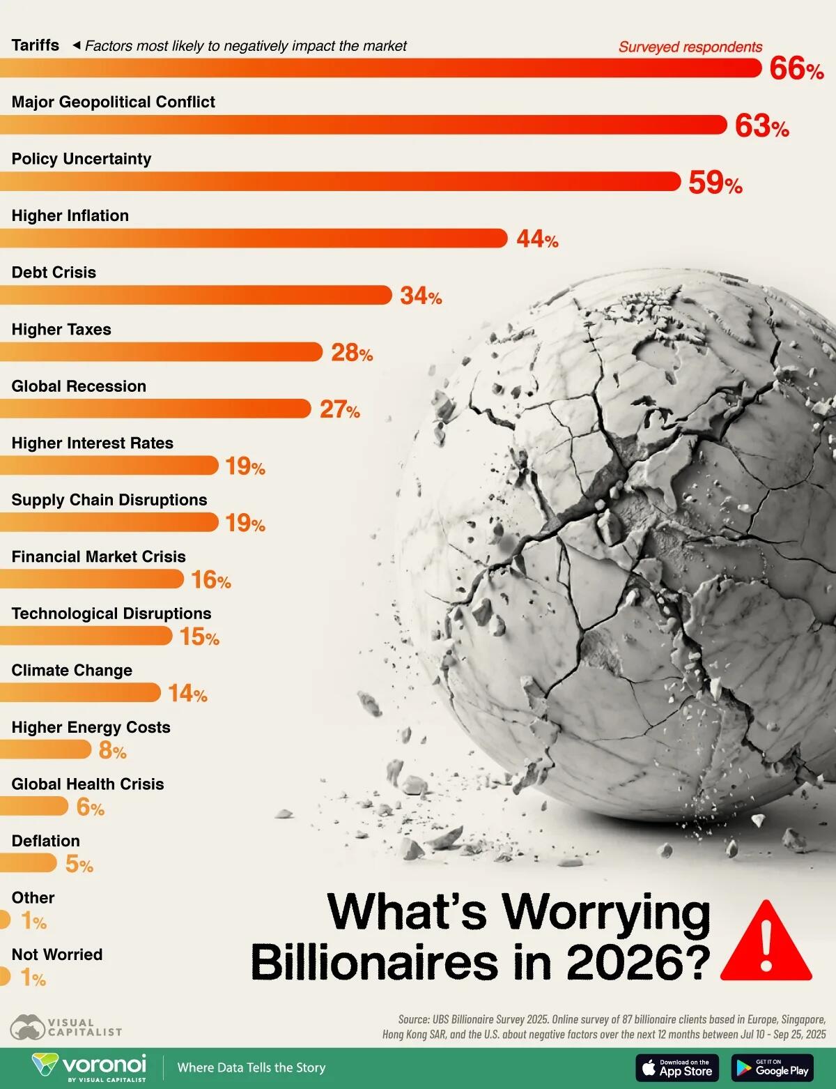 Interestingly, technological disruptions (15%) and climate change (14%) appear lower on the list, suggesting that billionaires may view these as longer-term or more manageable challenges compared to immediate political and economic shocks.