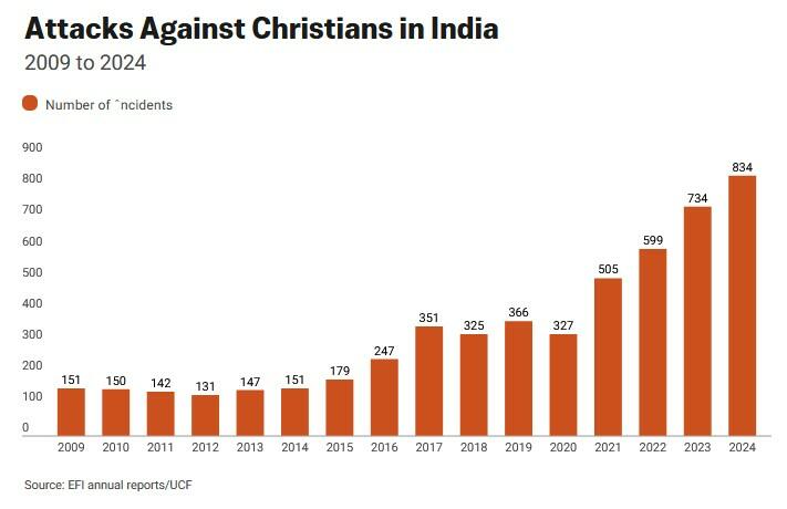 Statistics from the United Christian Forum, published on local website, The Wire, reflect an increase in violence against Christians in India in recent years. They documented 734 attacks targeting Christians in 2023. In 2024, that figure climbed to 834.