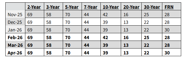 “While the administration’s focus on affordability measures has brought back questions about potential efforts to lower borrowing costs via more active adjustments to the issuance mix, we do not expect Treasury to do so at this point,” Goldman Sachs strategists William Marshall and Bill Zu wrote ahead of Wednesday’s release. Goldman’s take reflected the views of many dealers. Any move to cut sales of bonds, or 10-year notes, would have run against the department’s long-standing pledge to be “regular and predictable” in its debt management. Bessent himself invoked that language in a speech in November.