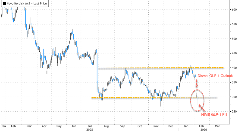 Shares dropped below the six-month base in the stock around the 300 kroner level after telehealth firm Hims & Hers Health rolled out a cheaper copycat version of Wegovy, delivering another blow to the beleaguered Danish drugmaker.