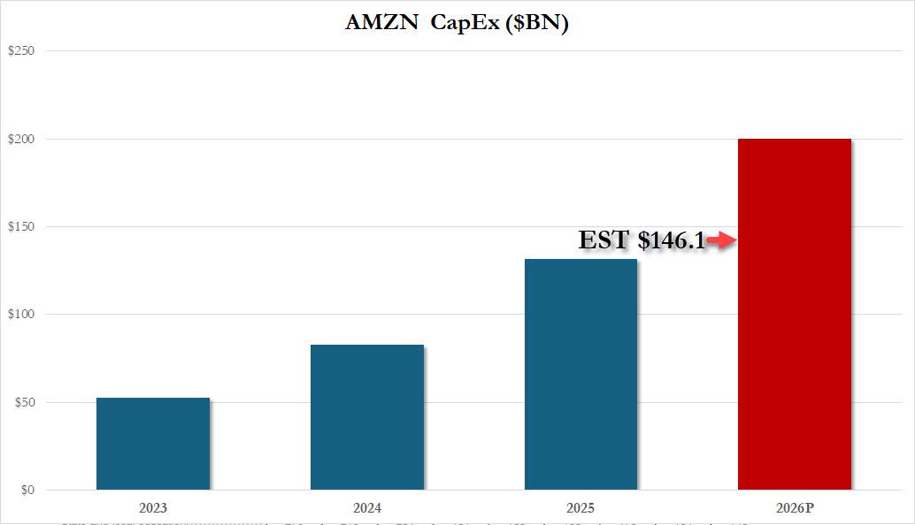But while revenue guidance was disappointing, if a bit muted, it was the company’s capex guidance – a first for AMZN – that stole the show, because with Wall Street estimates of $146.1 billion in 2026 capex, the company went and reported that it expects to invest about $200 billion in capital expenditures in 2026, a 50% increase from 2025 and an openly ridiculous number, one which is more than a quarter higher than the consensus estimate! Needless to say, there is just not enough grid capacity and electrical power to satisfy the $700BN in CapEx guidance among the Mag7s.