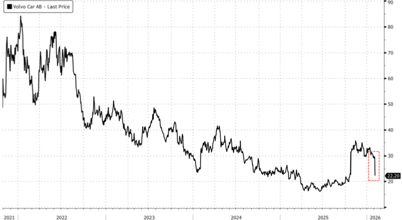Shares in Volvo Cars crashed the most on record in Stockholm, with Bloomberg data going back to late 2021, after it reported fourth-quarter earnings that missed analyst expectations.
