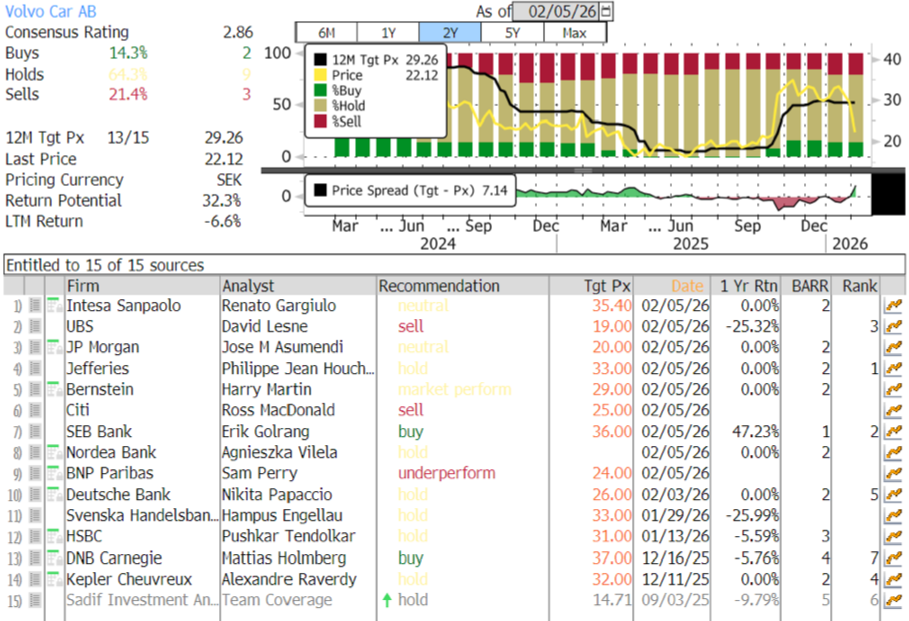 Wall Street analysts are mixed to bearish on Volvo. There are only 2 “buys,” with 9 “holds,” and 3 “sells.”