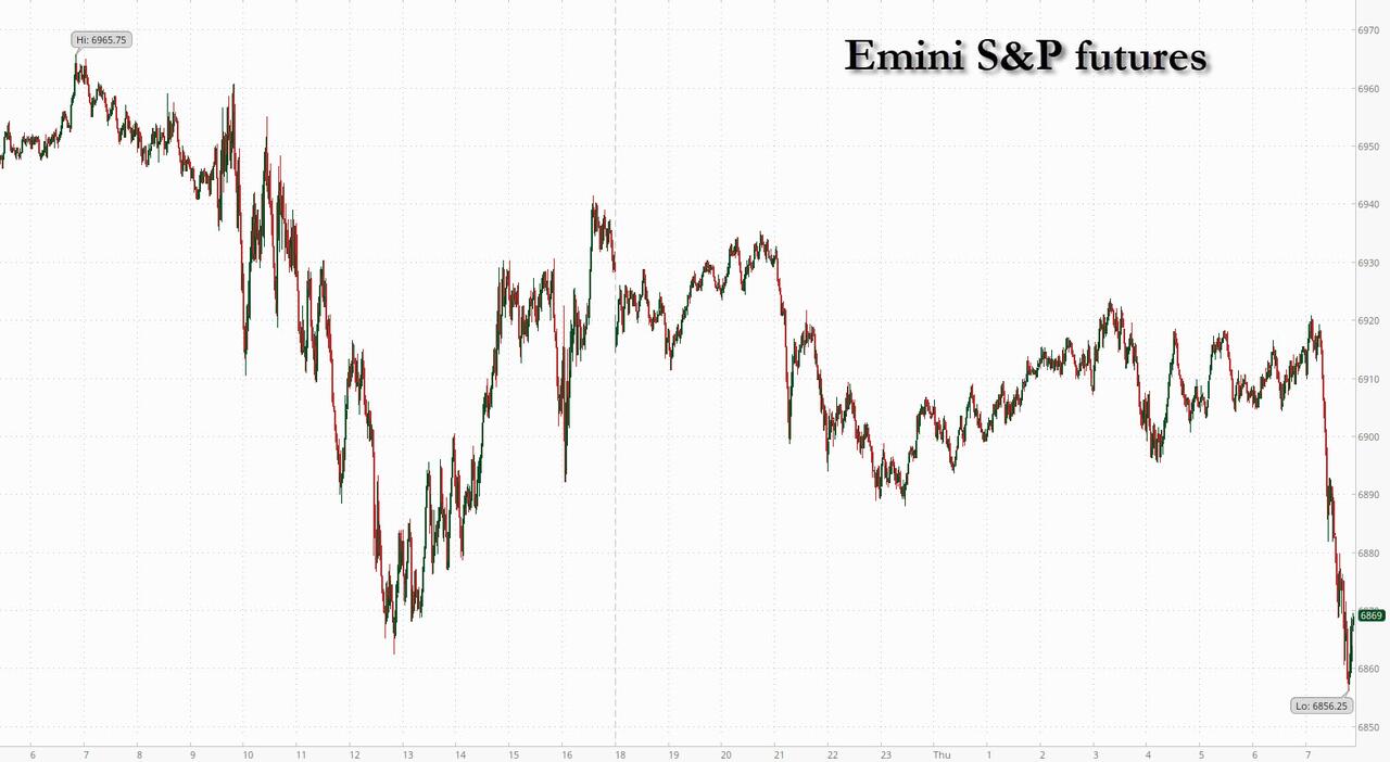 Stock futures slide, hitting session lows just after 7am ET, after a two-day drop that saw an ETF tracking software stocks sink to its lowest since April. As of 8:00am ET, S&P 500 futures have slumped to session lows, down 0.7% following a sharp slide just after 7am ET; Nasdaq 100 futures are also sharply lower, dropping 0.8% after the index wiped out its gains for the year over the prior two sessions. Alphabet is lower in after it said capex will reach as much as $185 billion this year, double what it was in 2025 and far more than the $120 billion analysts had predicted. Pre-market, Mag7 are all lower but GOOG’s capex guidance is boosting some semis who will benefit from the extra spending. This morning, the tech selloff was joined by a resumption in the precious metal liquidation as silver plunged -15% during China hours, and gold slid 3% following yesterday’s Momentum unwind (which continues today). The USD reversed all gains and traded near session lows as 10Y yields also dropped to session lows just over 4.25%. Today’s macro focus is on the jobs including claims and Challenger job cuts. We get Amazon earnings after the close.
